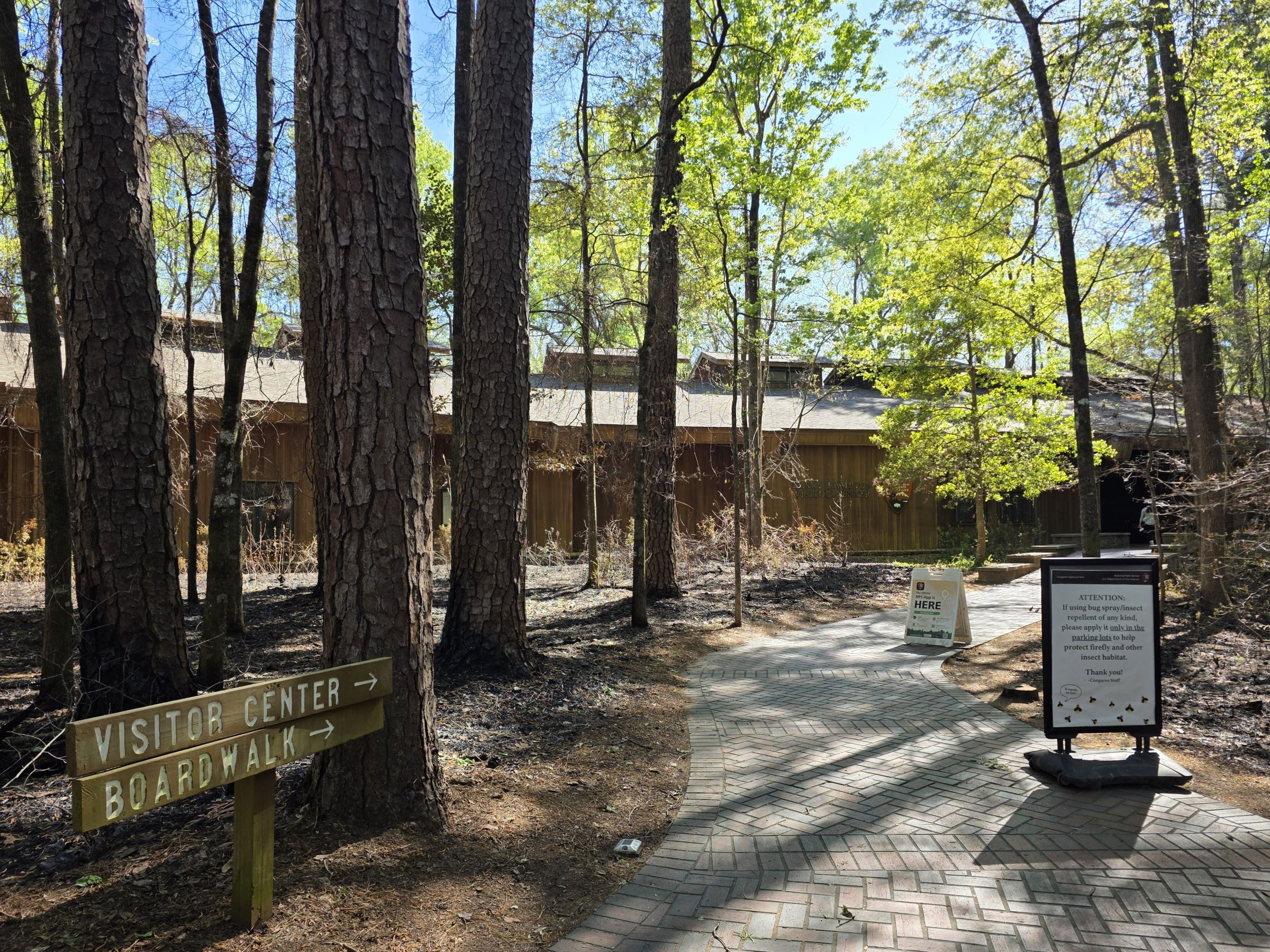 아주 길다랗게 지어놓은 해리햄프턴 비지터센터(Harry Hampton Visitor Center)를 향해 걸어가는데, 오른쪽 안내판에 버그스프레이 등을 숲속에서 사용하면 반딧불이 등의 다른 곤충들도 죽일 수 있기 때문에 여기 주차장에서 미리 뿌리라고 되어 있다. 그리고 비지터센터 이름은 1930년대부터 여기 원시 온대 활엽수림의 보호를 위해 활동했던 사람의 이름을 딴 것으로, 그는 1976년에야 여기가 콩가리 늪지 준국립공원(Congaree Swamp National Monument)으로 지정되는 것을 보고 4년 후에 사망했다는데, 괜히 정치인의 이름이 아니라서 참 다행이라는 생각이...