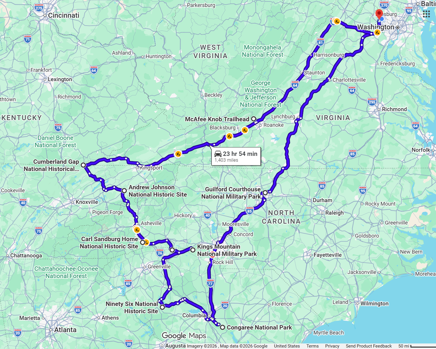 동부로 이사온 직후부터 <바람과 함께 사라지다>의 배경인 찰스턴과 더 아래 조지아 사바나(Savannah, 서배너)까지 로드트립을 꿈꾸다가, 2023년 초여름에 일주일 정도 시간을 내서 올라오는 길에 이 국립공원도 들릴 계획이었다. 그러나 딸의 졸업기념 가족여행인데 이왕이면 해외로 가자고 해서 당시 목적지가 다른 곳으로 급변경이 되었던 기억이 난다. 언젠가는 그 두 도시를 아내와 함께 방문하게 되겠지만 이 국립공원은 꼭 같이 갈 필요는 없다는 판단이 들어서, 아래 지도와 같은 경로를 단 2박3일로 자동차 여행을 혼자 또 다녀왔다.
